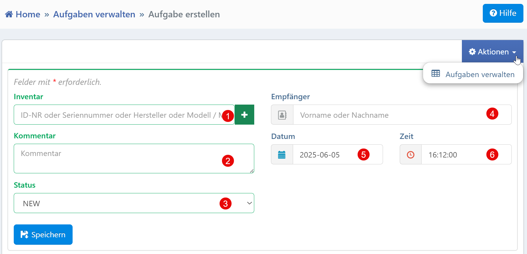 Aufgabenvergabe im Geraetekontext: Eine neue Aufgabe wird durch Eingabe des Inventars erstellt, z. B. bei Reparatur, Wartung oder Kalibrierung.