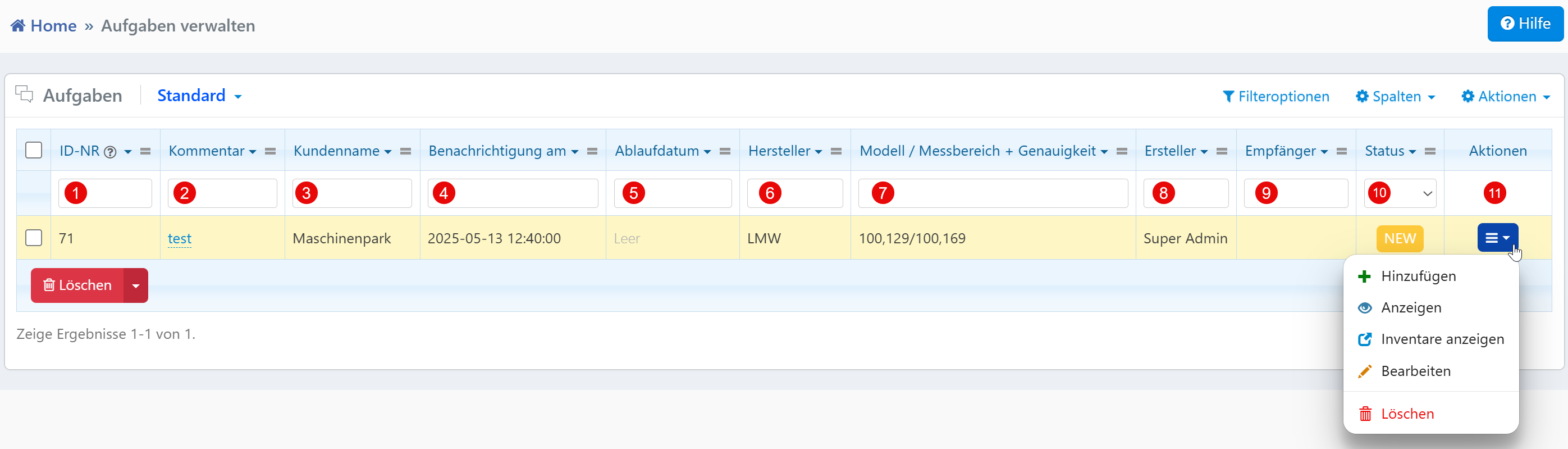 Die Aufgabenliste bietet eine zentrale Uebersicht, Steuerung und Pflege aller Aufgaben im System. Sie wird in Wartungs-, Support- und Qualitaetssicherungsprozessen eingesetzt und ermoeglicht eine schnelle Filterung sowie den direkten Zugriff auf weitergehende Aktionen pro Eintrag.