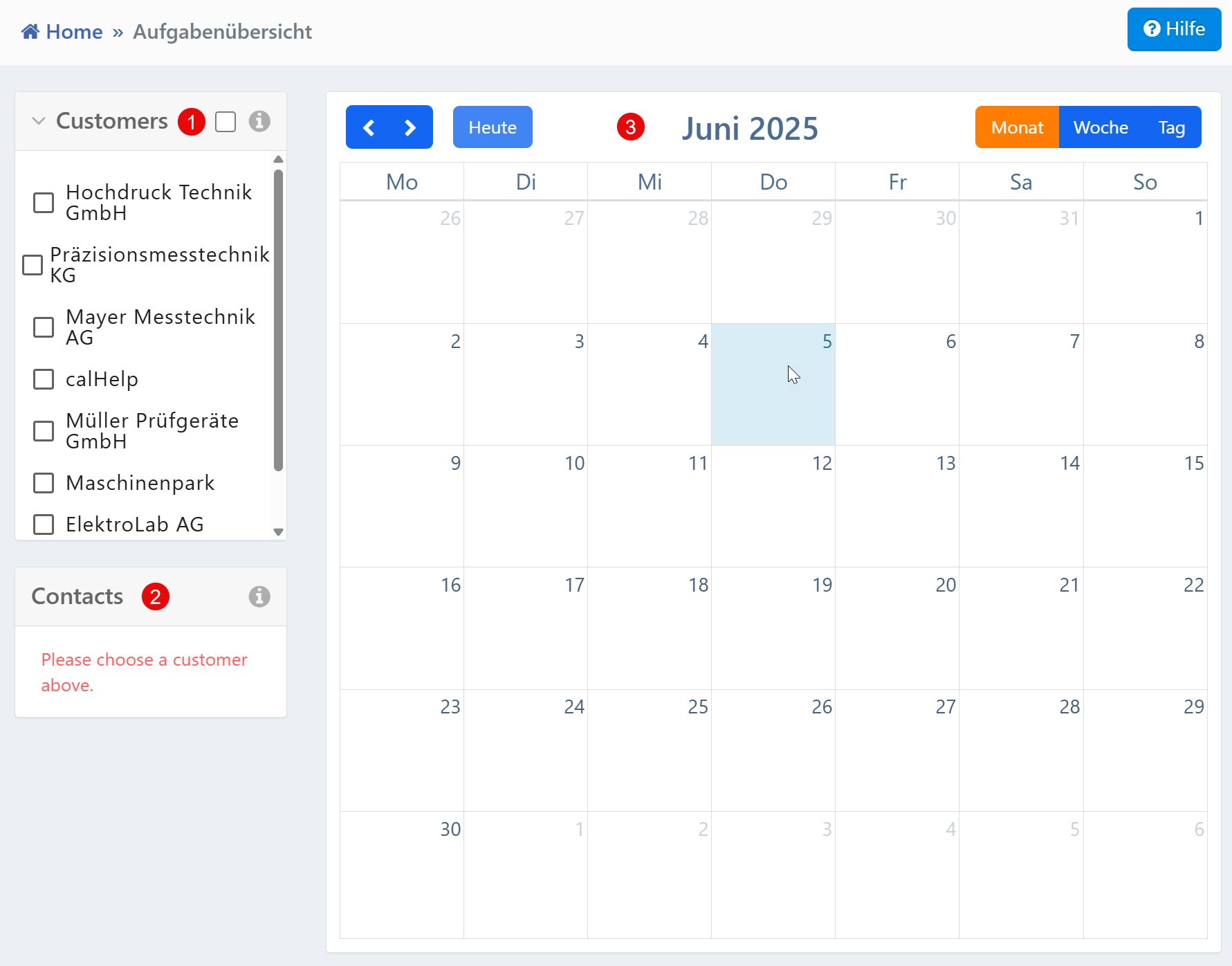 | ① | Kundenliste | Auswahlbereich zur Filterung der Kalenderansicht nach bestimmten Kunden. Mehrfachauswahl per Checkbox möglich. |
