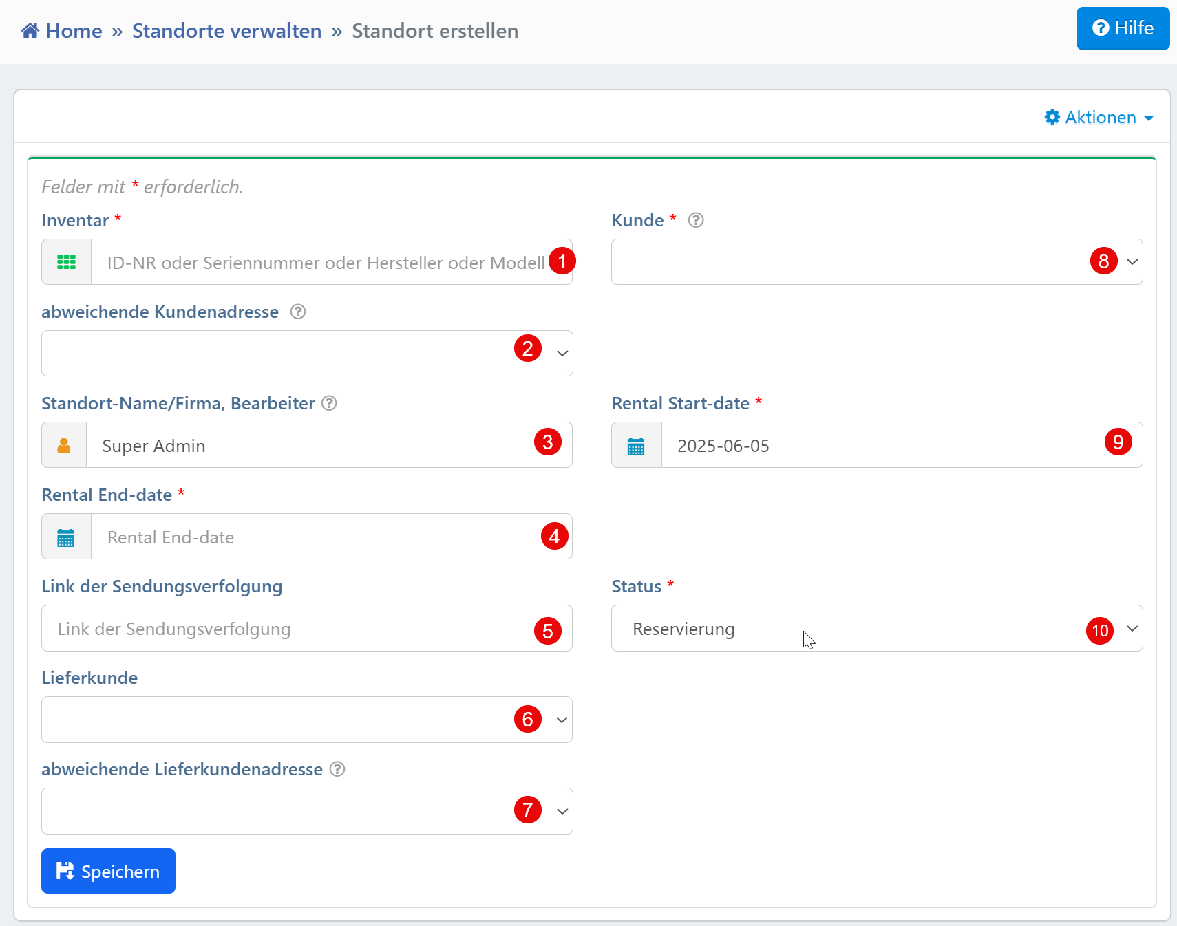 Das Formular zur Standorterstellung dient der Zuweisung eines Inventarobjekts zu einem Kundenstandort. Dabei werden relevante Informationen wie Kundenbezug, Zeitraum, Verantwortliche sowie optionale Adress- und Versanddaten erfasst.