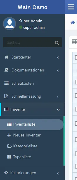 Das Hauptmenü und die Navigation in calServer ermöglichen den schnellen Zugriff auf alle relevanten Funktionen. Die Navigation erfolgt über eine klar strukturierte Seitenleiste, die sich je nach Nutzerrolle dynamisch anpasst.